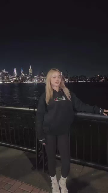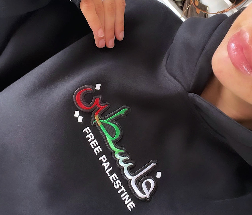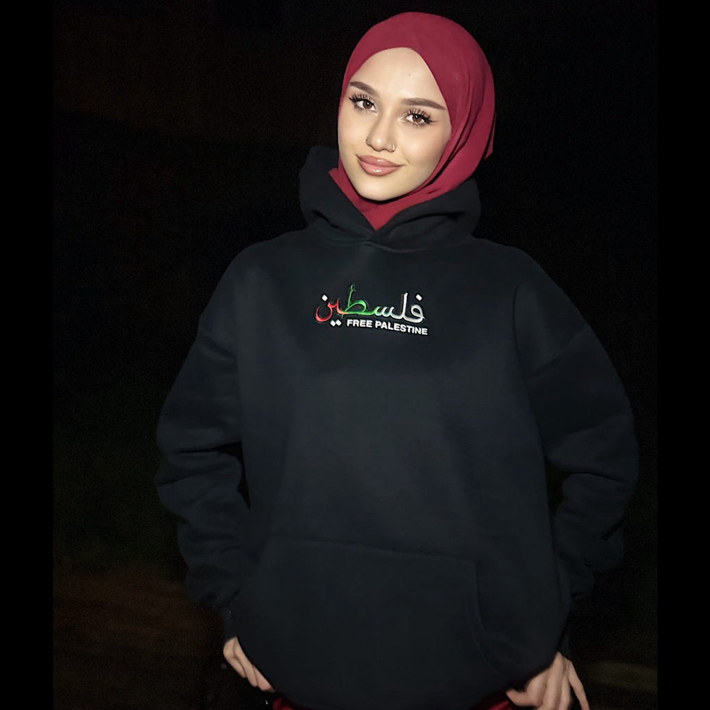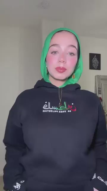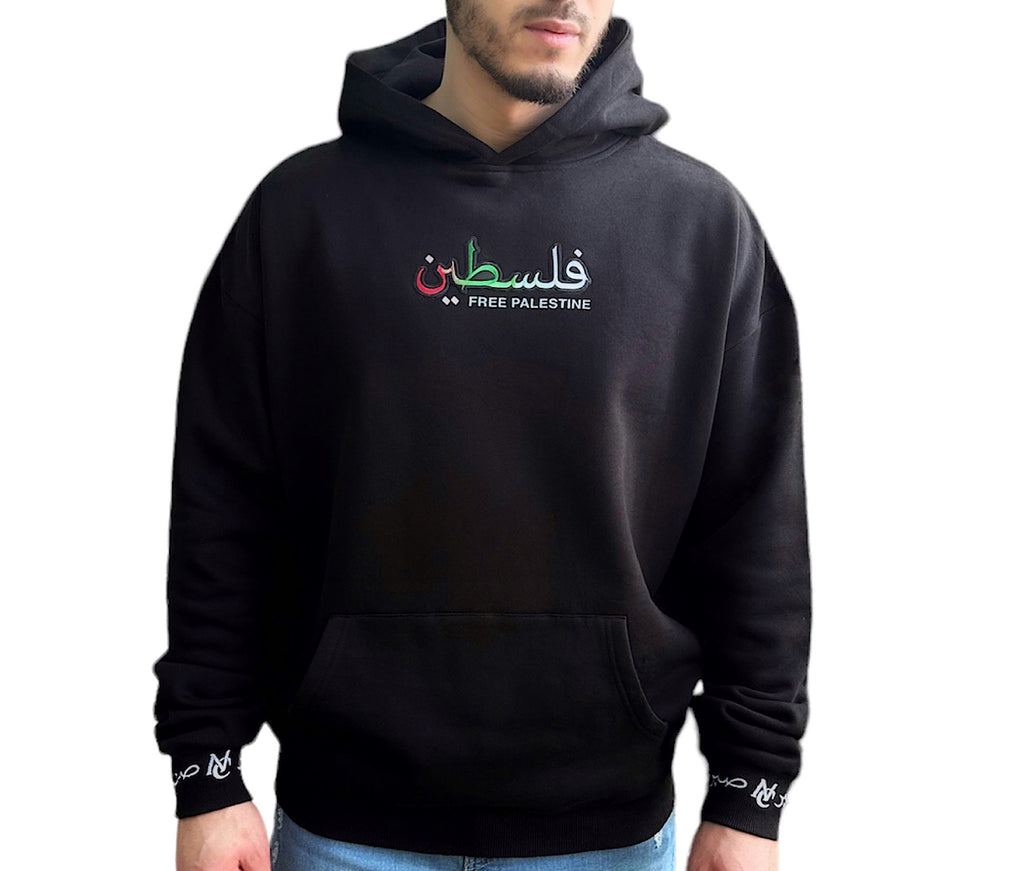 The front of the hoodie has an embroidery patch that says “Palestine” written in Arabic. The gradient colours (red, green & white) represents the colours of the Palestine flag.