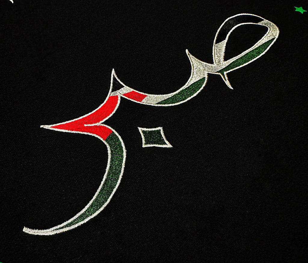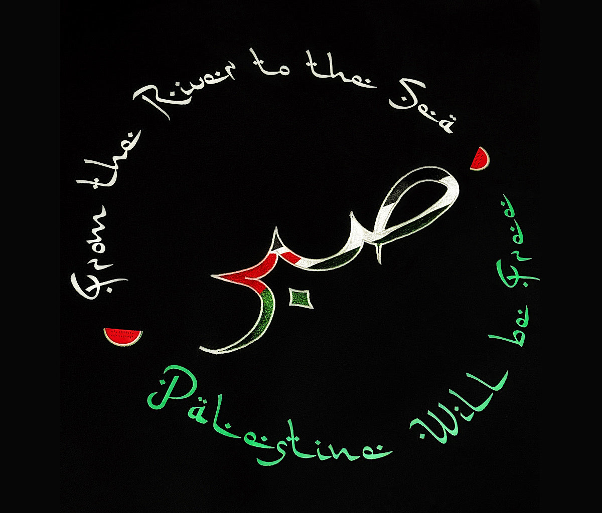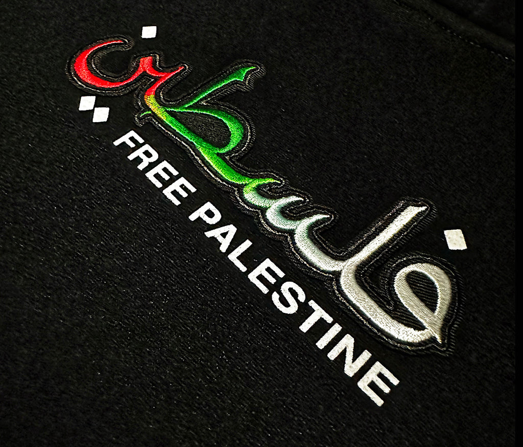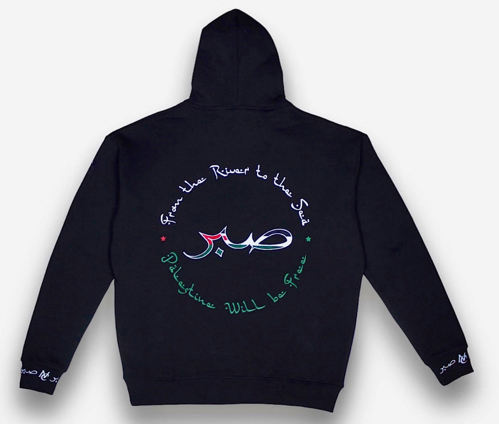 The centre of the circle is embroidered with the Palestine flag within the Sabr logo